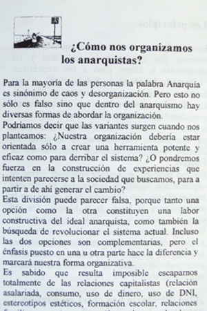 Aqui podrás encontrar textos que contienen los Principios que nos identifican, la forma de Organización que utilizamos y las Construcciones que intentamos realizar. La palabra escrita siempre resulta límitada para relatar las prácticas y experiencias que desarrollamos todos los días. Los documentos aquí expuestos nos sirven como referencia y orientación, nos ayudan a reconocer el camino que hemos elegido. Pero el Anarquismo se ha planteado siempre como un movimiento vital de transformación cotidiana, un esfuerzo por superar la distancia entre los fines perseguidos y los medios para conseguirlos, por eso, más allá de los documentos, te invitamos a vivirlo, a experimentarlo y a crearlo.